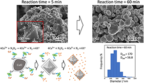 Copper fine particles were synthesized dispersant-free via a solid–liquid reduction method using copper oxide (CuO) and water as starting materials. Hydrazine monohydrate (N2H4·H2O) was used as a reducing agent and water as a dispersion medium, enabling the formation of Cu particles without generating harmful counterions or organic residues. Even under a high precursor concentration of 0.5 M, the addition of acetic acid and microwave heating promoted the reduction reaction, leading to the formation of fine and uniform Cu particles with an average diameter of 170 nm while suppressing oxidation and aggregation. Fourier-transform infrared spectroscopy analysis confirmed the absence of hazardous byproducts, although a small amount of acetohydrazide formed as a minor side product. Consequently, the obtained particles could be collected with a high yield (>90 %) simply by vacuum drying, without any washing process. This method significantly simplifies the Cu particle synthesis by eliminating washing and waste treatment steps, and is expected to serve as a low-cost, sustainable, and high-throughput manufacturing approach applicable to conductive inks and electronic materials.