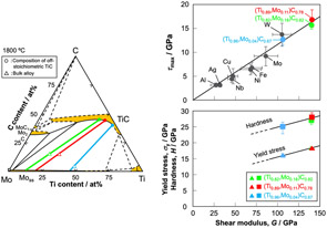 NaCl-type MX compounds, comprising transition metals and nonmetals, exhibit excellent mechanical and thermal properties, making them suitable for high-performance applications such as cutting tools and aerospace components. However, their ductility is limited, particularly in stoichiometric forms such as TiC. Therefore, further investigation into improvement of their deformability and overall mechanical performance using off-stoichiometry and alloying is required. This study investigates the deformation behavior and mechanical properties of off-stoichiometric TiC formed in Mo–Ti–C ternary alloys via micropillar compression and nanoindentation tests. The activation of the {111}〈1−10〉 slip system and no fracture were observed after the plastic strain exceeded 5 %, indicating enhanced deformability due to the off-stoichiometry. The maximum shear stress required to initiate plastic deformation (τmax) was proportional to the shear modulus, a trend consistent with the ideal strength observed in various metals. This finding suggests that τmax corresponds to the shear stress necessary for the initial nucleation of dislocations. Both the yield stress and hardness increased with increasing shear modulus, indicating that these properties are governed by the Peierls stress in the large-strain regime. Overall, the findings demonstrate that the deformation in the ductility-enhanced off-stoichiometric TiC is dominated by dislocation motion and that its strength is primarily controlled by shear modulus.