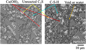 This study investigates the microstructure of hydrated Ca3SiO5 (C3S) and the interfacial transition zone (ITZ) between an aggregate and hydrated C3S, both of which critically influence the properties of concrete. Because cementitious materials are normally wet, it is difficult to observe their microstructure using scanning electron microscopy. Therefore, the microstructure was examined using X-ray computed nano-tomography at SPring-8 (with a spatial resolution limit of ∼100 nm), which enables the nondestructive imaging of internal structures in the atmosphere. X-ray computed nano-tomography allows observation of the microstructure in the wet state, where residual water is present and hydration products remain intact. The analyses revealed the formation of a calcium silicate hydrate, while Ca(OH)2 particles with diameters of several micrometers were not detected during the initial stage of hydration. At this stage, Ca(OH)2 likely dissolved in water in a supersaturated state with respect to Ca2+ ions, or alternatively, Ca(OH)2 nanoparticles (<100 nm) may be dispersed in the aqueous phase. In the hydrated mixture of C3S and SiO2 (aggregate), Ca(OH)2 particles with diameters of several micrometers were not present at the interface between C3S and SiO2 (ITZ) but were located around the hydrated C3S particles, a phenomenon that differs from previously reported observations. These findings contribute to the understanding of the formation behavior of the calcium silicate hydrate and microstructure of the ITZ.