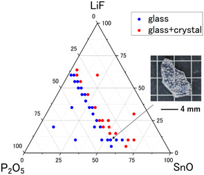 SnO–P2O5 glasses are known to have a low glass transition temperature (Tg) and can be vitrified in combination with metal oxides and halides. In this study, the glass-forming region in the LiF–SnO–P2O5 system was determined and the properties of the obtained glasses were characterized. The starting materials were melted at 400 °C, and the glass-forming regions in the LiF–SnO–P2O5 system were determined using X-ray diffraction and thermal analysis. The glass-forming region was restricted to P2O5 contents of at least 36 mol %, which is close to pyrophosphate, in LiF-rich compositions (≥30 mol %). On the other hand, the region extended to near the orthophosphate composition with high SnO content, such as 10LiF·62SnO·28P2O5 (mol %). The glass transition temperature of the prepared glasses ranged from around 150 to 210 °C. Sn K-edge X-ray absorption fine structure spectra of 10LiF·62SnO·28P2O5 (mol %) glass showed that the valence of Sn is predominantly Sn(II). The X-ray photoelectron spectra confirm the formation of P–F bonds in the glasses. A chemical durability test in the ambient atmosphere revealed that the glasses in the LiF–SnO–P2O5 system have relatively high chemical durability. AC impedance measurement showed the glass has ionic conductivity in the order of 10−8 S cm−1 at room temperature.