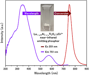 Cr3+-activated near-infrared emitting phosphor has a potential application in plant growth and sensing technologies. Herein, we synthesized near-infrared emitting La1−x/3Al1−x−yTixO3:yCr3+ phosphor by a solid-state reaction. La1−x/3Al1−x−yTixO3:yCr3+ (x = 0.2, y = 0.003) showed the near-infrared emission at 751 nm with a full width at half-maximum of 41 nm under 351 nm excitation. The internal and external quantum efficiencies were 54.4 and 25.5 %, respectively. The luminescence intensities at 150 °C of the La1−x/3Al1−x−yTixO3:yCr3+ (x = 0.1, 0.2, and 0.3, y = 0.003) were 32, 17, and 3 % of those at room temperature, respectively. The thermal quenching effect strongly occurred with increasing the amount of Ti and it was related to the change in the absorbance edge of the host material La1−x/3Al1−x−yTixO3.