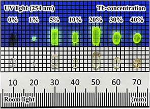 Gd9.33−xTbx(SiO4)6O2 (x = 0, 0.093, 0.467, 0.933, 1.866, 2.799, 3.732) oxyapatite single crystals were grown by the floating zone method, and their photoluminescence (PL) and scintillation properties were systematically investigated. Under UV and X-ray excitation, the samples exhibited emission peaks due to the 4f–4f transitions of Gd3+ and Tb3+. The decay times were on the milliseconds scale, consistent with Tb3+ emission. The PL quantum yields of the 1–30 % Tb-doped samples were approximately 70 %, and the light yield of the 10 % Tb-doped sample was 15400 photons/MeV, as calculated from the pulse height spectra under 137Cs γ-ray irradiation.