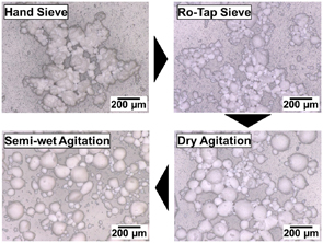 Granulation of alumina powder was performed, and the characteristics of the resulting granules and the sintered bodies produced from them were evaluated. The granulation processes were conducted under the following conditions: hand sieving (HS), sieving using a rotating and tapping shaker (Ro-Tap sieving, RTS) which involves a tumbling motion; dry agitation granulation using a high-shear mixer (AD); and semi-wet agitation granulation with binder addition (AB). The granulation effect increased progressively in the order of HS, RTS, AD, and AB. As the granulation effect increased, the granules became larger and more spherical, and their size distribution became narrower with a sharper peak. The loose bulk density increased and the angle of repose decreased, whereas the tapped bulk density showed no significant change due to the collapse of the granules. Although the strength of the granules increased with the progression of granulation, the strength of the sintered bodies decreased. This phenomenon is considered to result from the stronger granules being less prone to collapse during compaction, which led to the formation of residual pores between granules in the green bodies. These pores subsequently became defects in the sintered bodies, which reduced their strength.