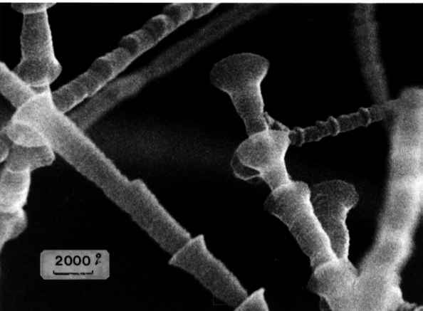 hBNは結合に強い異方性があり、普通c軸に直角な薄い板状結晶になる。 写真の繊維は珍しくc軸方向に伸長している。ラッパを積み重ねたような形態が この異常な成長を解明するヒントを与えているようだ。