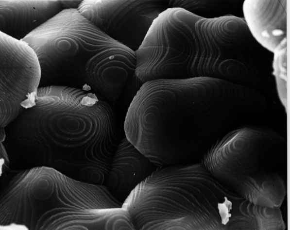 石灰石を重油焼成炉にて焼成して得られた生石灰に認められたもので、 粒径は約15μに発達している。Stepが粒界において連続しているのが観察される。