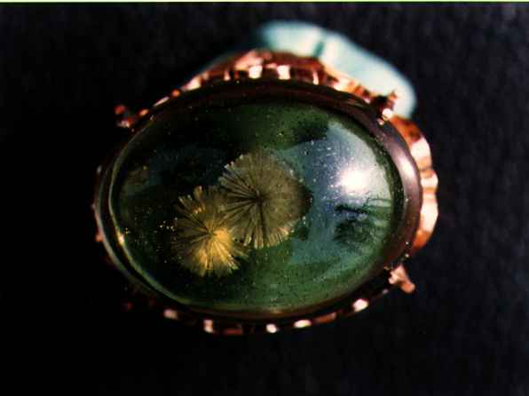 ハニカム用コージライト製造中、たまたま過焼した際メルト中に生成した菊花模様 結晶。直径10mm結晶はコージライトと推定される。指輪に加工された。