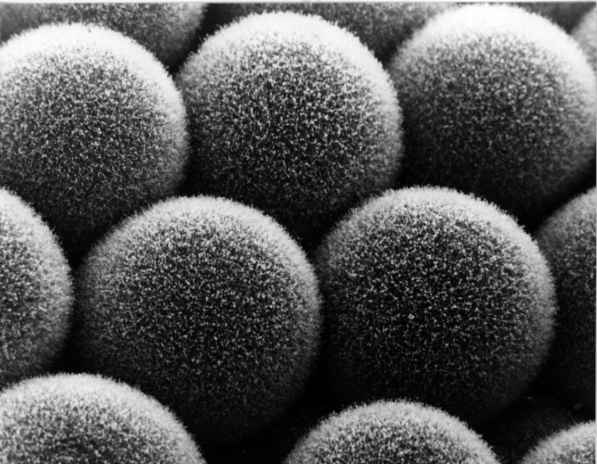 2〜3wt%の鉄を担持した約100μmの硬質炭素粒子状で、ベンゼン、硫化水素、 水素の混合ガス(40cc/min)を、1100℃で30分間熱分解させ、炭素粒子表面に 高密度で生成した長さ10〜20μm、径1μm以下の針状炭素繊維。