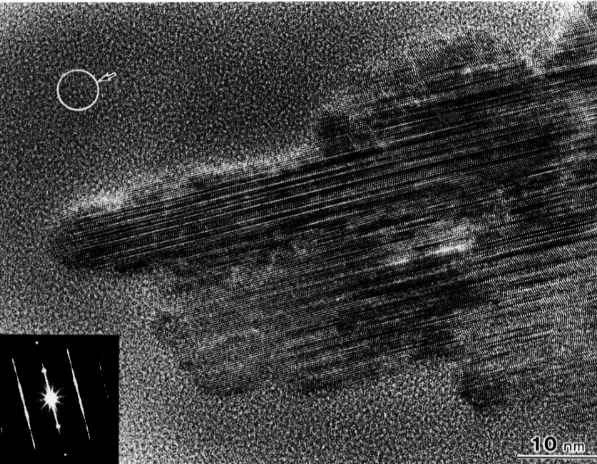 アモルファスのマトリックス中にβ-SiCの微結晶が核形成・成長する。写真は