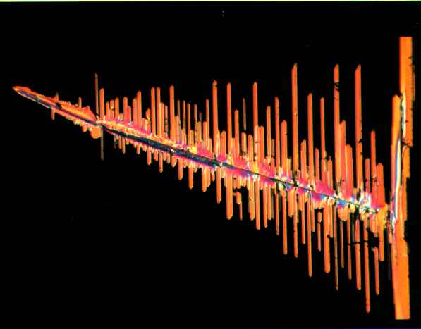 この写真は櫛状のテルルの単結晶である。もともとこの結晶は金属光沢を持つ黒い 色をしているが、微分干渉顕微鏡で撮ると、結晶面が傾斜していると異なった色を 呈する。CdTeの熱分解により、約400℃のところにテルルの結晶が成長した。 櫛状の針の方向はc軸である。
