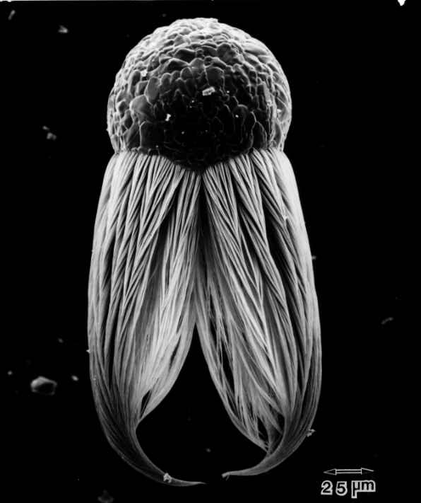 板を高温加熱する際、板状にある種の 金属元素が付着していると、これを起点としてクリストバライト結晶が成長 することがある。成長の模様は種々様々である。ここではクラゲ状を呈した SEM写真を示す。