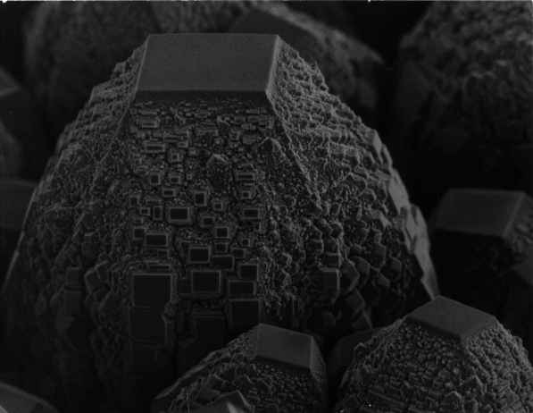 酸素−アセチレン系燃焼炎により大気中で合成したダイヤモンド。アセチレンが やや過剰な条件で合成した。頂上に自形の明確な(100)面、側面に無数の(100)面 が同一方向に現れている。成長気孔については現在検討中。