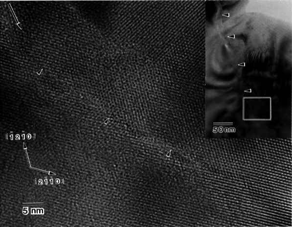 電子顕微鏡像である。き裂をはさんた両側の原子配列は半原子程度ずれている。