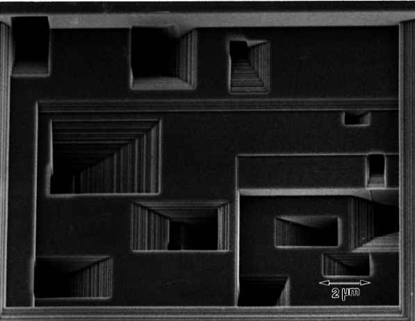 アセチレン−酸素系の燃焼炎で、単結晶MgOの{100}面を数分間加熱したときに できるエッチピット。{110}面上に存在するらせん転位が、<110>方向に エッチングされ、それが内部に進行している様子がよくわかる。
