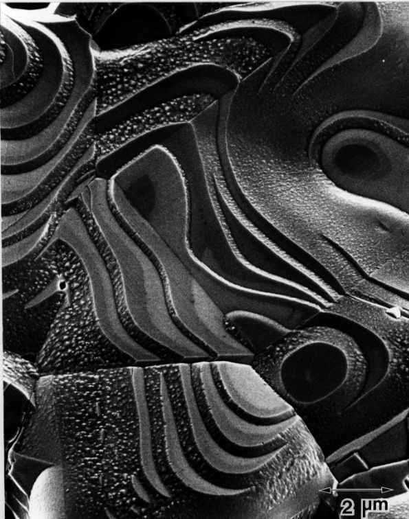 酸化銅焼結体表面には焼結条件により多様な成長ステップが観察される。 各粒子の方位によりステップ構造が異なり、段々畑を連想させる。 表面を酸処理すると粒表面の溶解速度が方位に依存するため、 さらに複雑な構造が観察される。