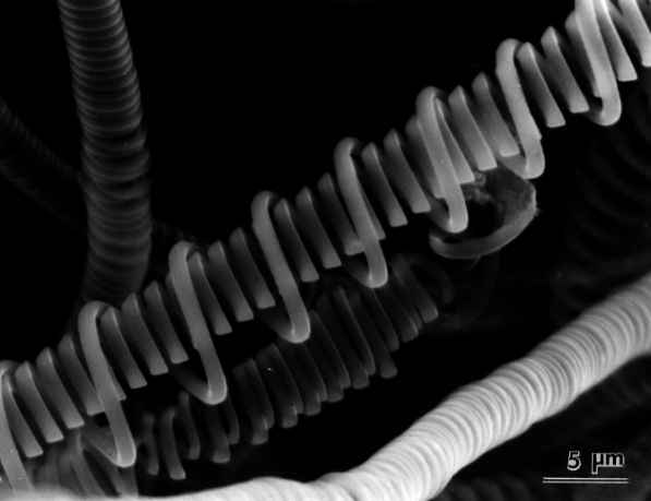 学術・技術的な意義 1本のコイルの外側に、これよりコイル系とピッチの大きな他のコイルが巻いており、 新しいコイル化機構を示唆している。