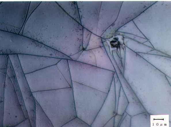 学術的な意義: TiO2の結晶化によって亀裂が生じ、それがまるでステンドグラスの鉛線の役割をしているようである. しかも膜厚の微妙な差により、中心部にほのかに干渉色が見られる.