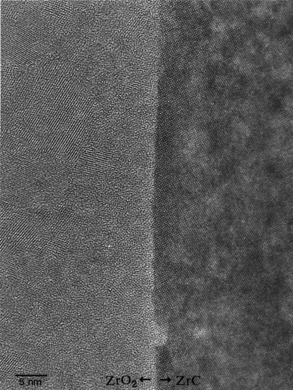 ZrCはダイヤモンドと同じ位硬く、酸化相は非常に柔らかい。このような試料から電子顕微鏡観察用試料を作製することは極めて難しく、イオンエチング/観察を何回も繰り返して最終的にTEM観察が可能な試料を作製できた。