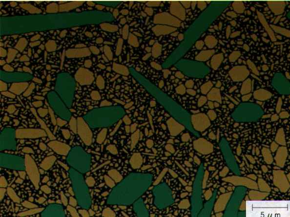 核として成長した柱状粒子からなる自己複合組織であった。この写真は、画像解析で