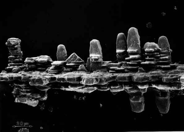 技術的な意義: 大きさ数百ミクロンの付着物を採取してSEM観察した。夾雑物の付着が少ない ものを発見するのに苦労した。また、立体的な構造の被写体に対して均一な コントラストが得られるよう、導電コート量や加速電圧の最適化を図った。