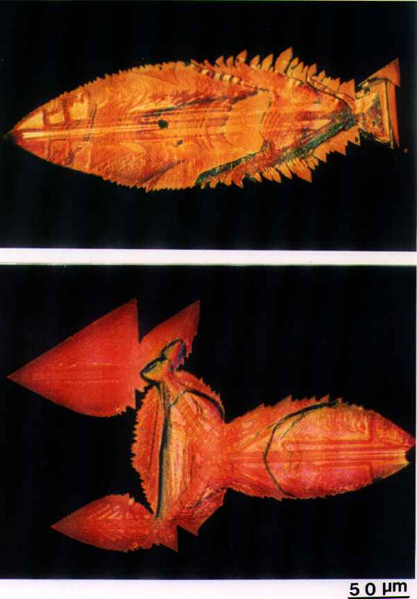 上の写真:魚の口に当たるところが結晶の根元であり、尾の部分は結晶の