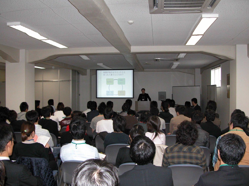 去る平成19年11月2日(金)、株式会社ノリタケカンパニーリミテドにおきまして、第35回東海若手セラミスト懇話会2007年秋期講演会を開催致しました。 大阪大学産業科学研究所 セラミック構造研究分野 助教 楠瀬 尚史氏とマルイ クレイ アンド セラミックス株式会社 代表取締役専務 伊藤眞一郎氏から、それぞれ「構造用セラミックス複合材料の開発 −多機能な材料を目指して−」、「国産陶磁器製造の現状」と題してご講演いただきました。楠瀬氏からは、Si3N4/BNナノコンポジット材料の研究成果をはじめ、セラミックスの問題克服に対するナノコンポジットがもつ可能性の大きさを語っていただきました(→写真1)。 また、伊藤氏は陶磁器製造の基礎から、国内外の陶磁器産業が抱える諸問題までメーカーの立場から示唆に富んだ講演をいただきました(→写真2)。